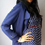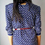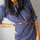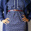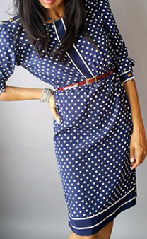 Va-va voom! What a classy dress. Navy blue, with white polka dots with accent swirl design brass buttons. Three quarter sleeves that button. Sleeves, front panel, and hem have contrasting solid blue and white stripes.